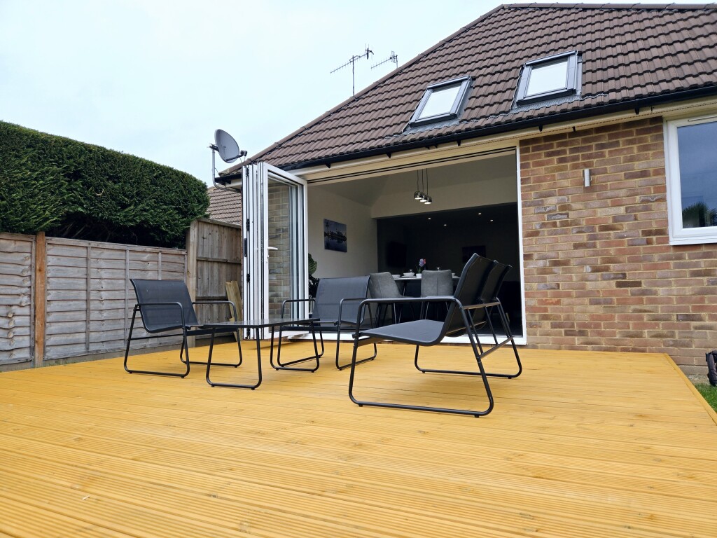 The living area features two additional sofa beds only upon request, providing flexible sleeping arrangements. The open-plan kitchen, dining, and living space is bright and inviting, with bi-folding doors opening onto a new decked area with a private lawn and outdoor seating - perfect for relaxing after a busy day or enjoying morning coffee outdoors.